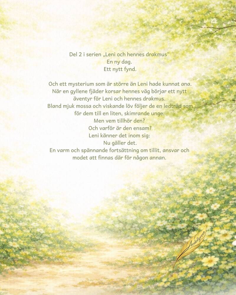 Leni och hennes lilla drakmus följer ett gyllene spår genom skogen och hittar en liten fågelunge som behöver hjälp. Varmt berättad, barnvänlig och med stillsam spänning väver berättelsen samman vänskap, hjälpsamhet, natur och små under.