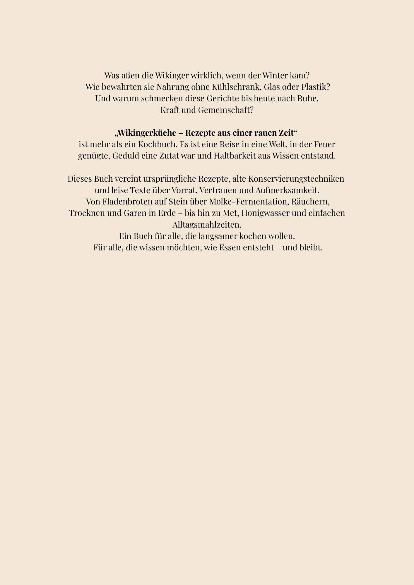 „Wikingerküche“ ist eine ruhige, atmosphärische Sammlung nordisch inspirierter Rezepte und alter Vorratsmethoden. Es geht um einfache Gerichte, Feuer, Rauch, Geduld und das Wissen, Nahrung haltbar zu machen.