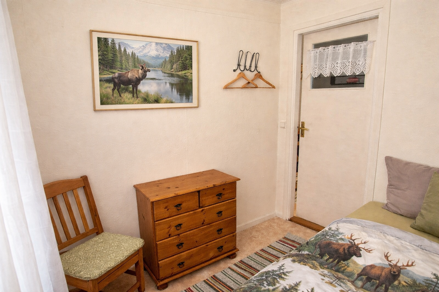 Klein, aber dennoch geräumig und mit allem ausgestattet was man zum entspanntem Schlafen braucht. Ein bequemes Einzelbett (90 x 200 cm) eine Kommode mit ausreichend Platz, Kleiderhaken, Ablagen, Nachtlicht und Spiegel. Auch dieses Zimmer ist selbstverständlich mit Verdunklungsrollo und mit einem Mückennetz in den Sommermonaten ausgestattet, damit du das Fenster offen lassen kannst ♡
