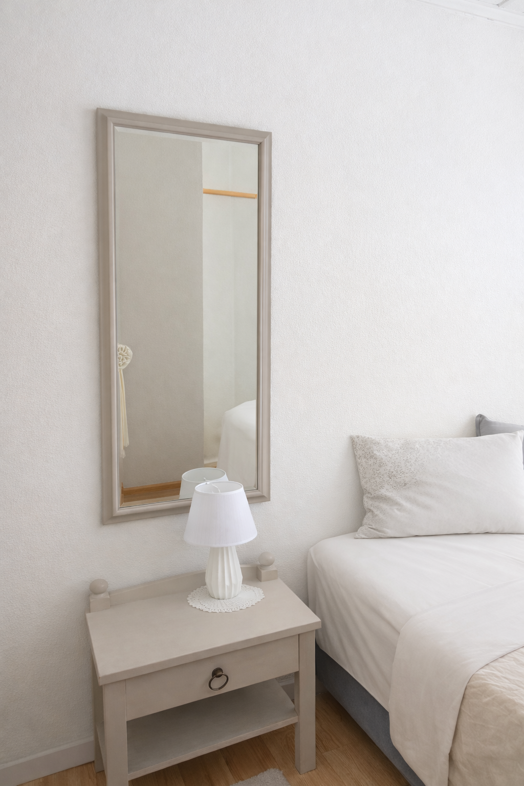 In diesem gemütlichen Schlafzimmer kannst du entspannen und die Seele baumeln lassen – sei es allein oder mit deinem Lieblingsmenschen. Mit einem bequemen Boxspringbett (140 x 200cm) und allem, was du brauchst, wird es auch hier angenehm für dich sein. Natürlich findest du auch in diesem Zimmer ausreichend Platz für Kleidung und andere persönliche Dinge. Auch deine Fellnase hat hier ein ruhiges Plätzchen. Selbstverständlich haben wir auch diesen Raum mit Kleiderbügel, einen großen Spiegel, Verdunklungsrollos und in den Sommermonaten mit eiemn Mückennetz ausgestattet. ♡